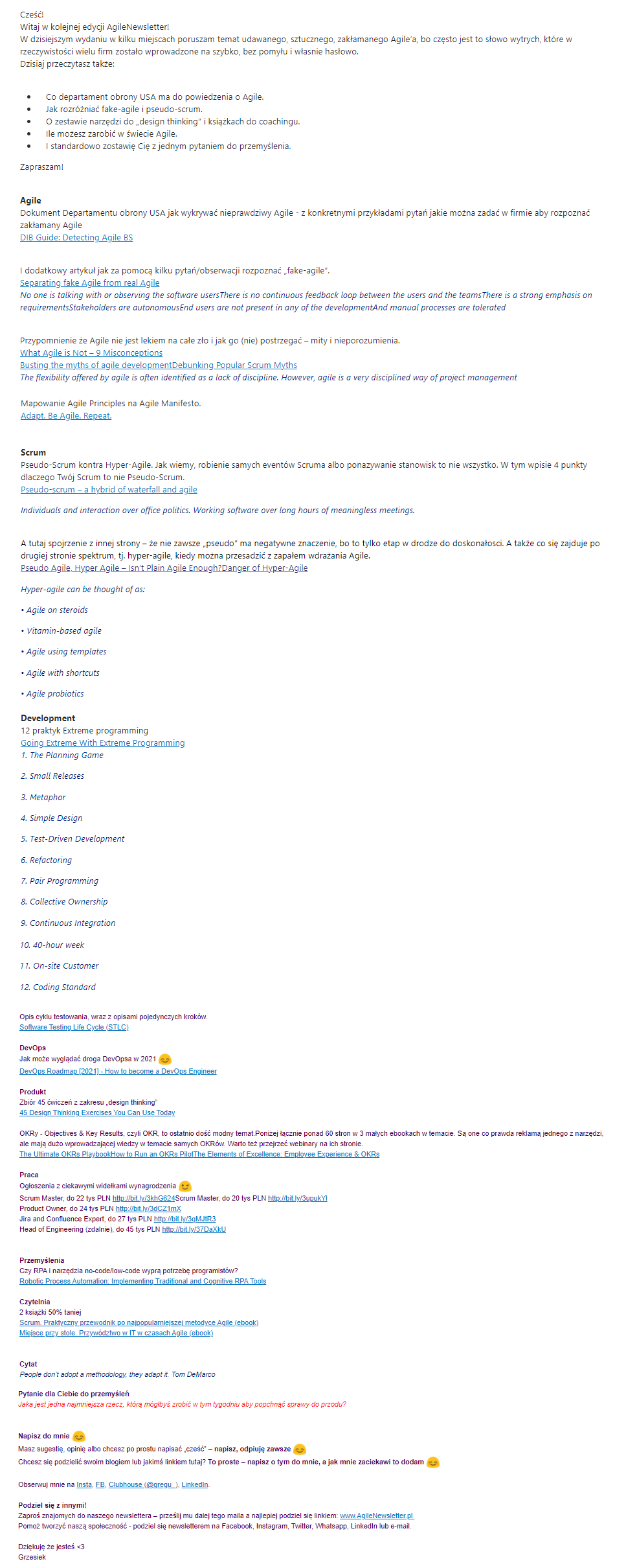 Zgromadziłem dużo materiałów - wyszukałem lub opracowałem sam - i wciąż znajduję i przygotowuję nowe, aktualne. Newsletter to moja prywatna inicjatywa, chcę się dzielić wiedzą i zbudować szeroką społeczność Agile.